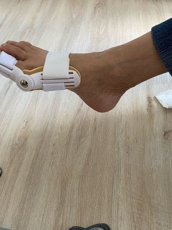 The corrector is a splint that is put on the foot to gently pull the big toe outwards and realign it to its original shape.